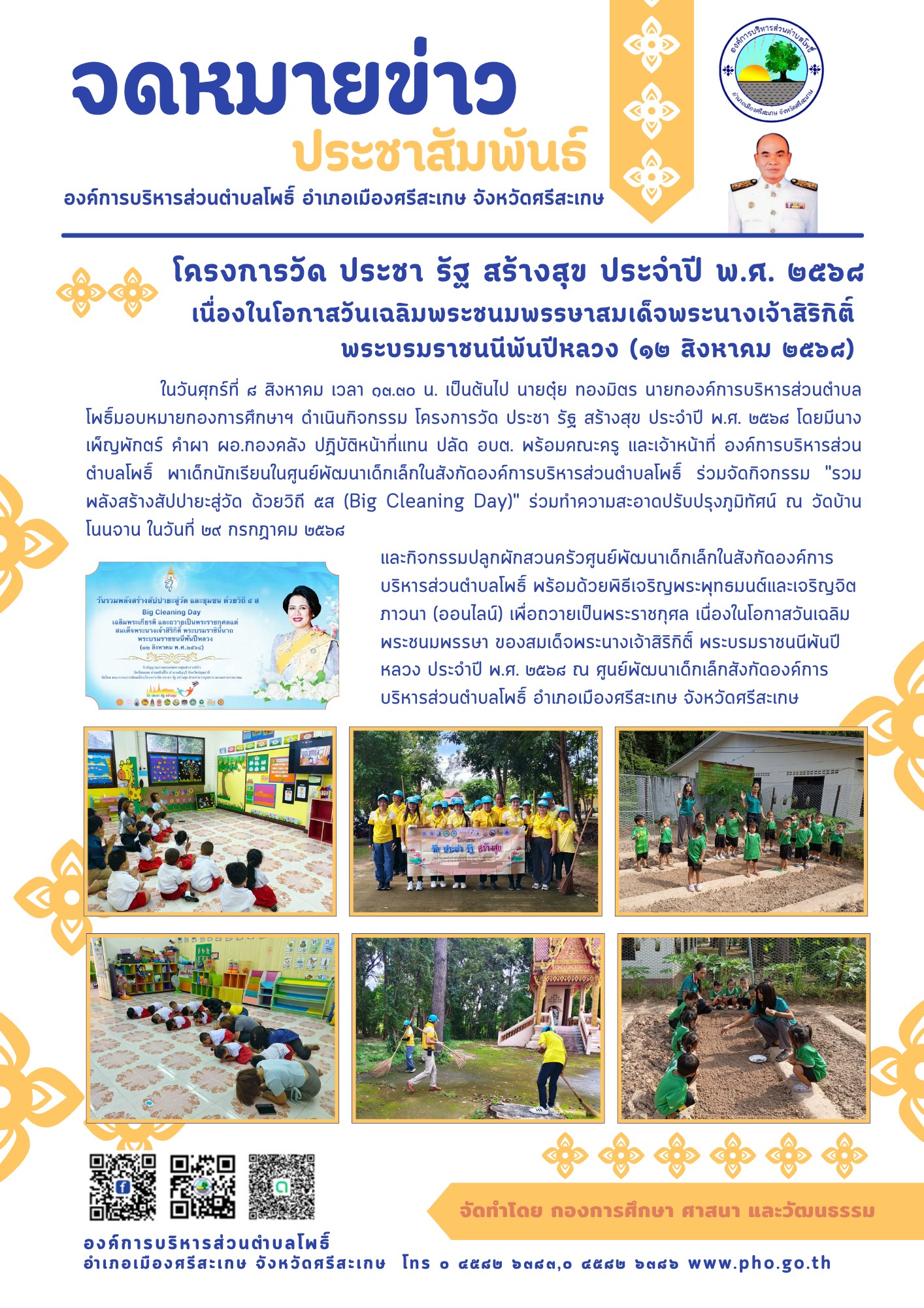 เนื่องในโอกาสวันเฉลิมพระชนมพรรษาสมเด็จพระนางเจ้าสิริกิติ์ พระบรมราชนนีพันปีหลวง (๑๒ สิงหาคม ๒๕๖๘) ในวันศุกร์ที่ ๘ สิงหาคม เวลา ๑๓.๓๐ น. เป็นต้นไป นายตุ๋ย ทองมิตร นายกองค์การบริหารส่วนตำบลโพธิ์มอบหมายกองการศึกษาฯ ดำเนินกิจกรรม โครงการวัด ประชา รัฐ สร้างสุข ประจำปี พ.ศ. ๒๕๖๘ โดยมีนางเพ็ญพักตร์ คำผา ผอ.กองคลัง ปฏิบัติหน้าที่แทน ปลัด อบต. พร้อมคณะครู และเจ้าหน้าที่ องค์การบริหารส่วนตำบลโพธิ์ พาเด็กนักเรียนในศูนย์พัฒนาเด็กเล็กในสังกัดองค์การบริหารส่วนตำบลโพธิ์ ร่วมจัดกิจกรรม "รวมพลังสร้างสัปปายะสู่วัด ด้วยวิถี ๕ส (Big Cleaning Day)" ร่วมทำความสะอาดปรับปรุงภูมิทัศน์ ณ วัดบ้านโนนจาน ในวันที่ ๒๙ กรกฏาคม ๒๕๖๘ และกิจกรรมปลูกผักสวนครัวศูนย์พัฒนาเด็กเล็กในสังกัดองค์การบริหารส่วนตำบลโพธิ์ พร้อมด้วยพิธีเจริญพระพุทธมนต์และเจริญจิตภาวนา (ออนไลน์) เพื่อถวายเป็นพระราชกุศล เนื่องในโอกาสวันเฉลิมพระชนมพรรษา ของสมเด็จพระนางเจ้าสิริกิติ์ พระบรมราชนนีพันปีหลวง ประจำปี พ.ศ. ๒๕๖๘ ณ ศูนย์พัฒนาเด็กเล็กสังกัดองค์การบริหารส่วนตำบลโพธิ์ อำเภอเมืองศรีสะเกษ จังหวัดศรีสะเกษ